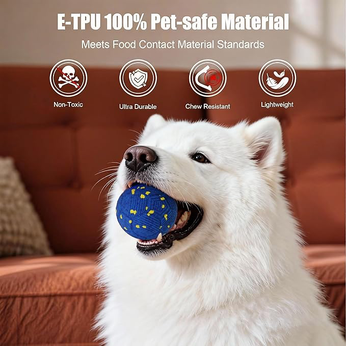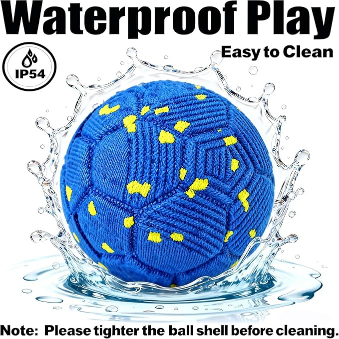 • Waterproof & Easy-to-Clean Design: With IP54 waterproof rating, the ball works indoors, outdoors, or even on wet grass. Cleaning is a breeze—simply wipe dirt or rinse the tightly sealed shell. Its lightweight build (3.26 inch diameter) also makes it perfect for travel, fetch, or solo play